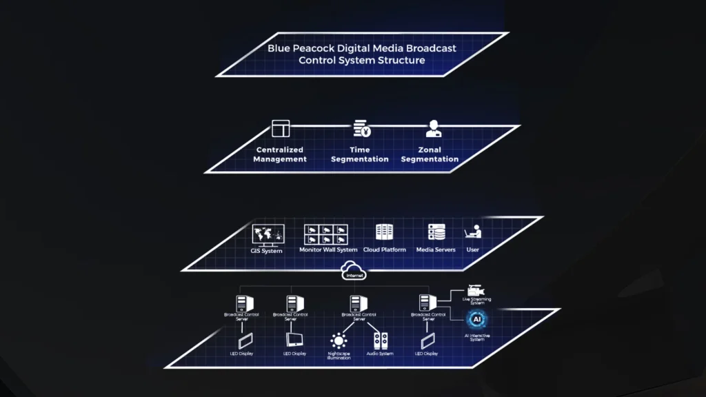 Blue Peacock is a professional information publishing system for centralized remote management of electronic media in the advertising industry. The platform provides one-stop services including centralized media management, remote content publishing, and device monitoring and maintenance.